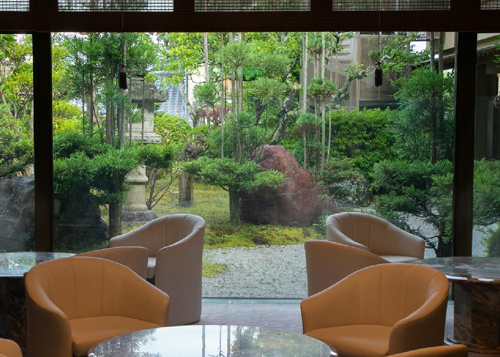 壁一面の大きな窓からは、当館自慢の庭園がご覧いただけます。到着されましたら、まずはロビーに配置されたソファでお寛ぎいただきながら、窓から見える四季折々の景色をお楽しみください。